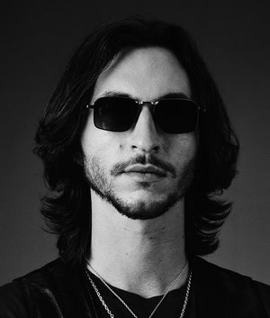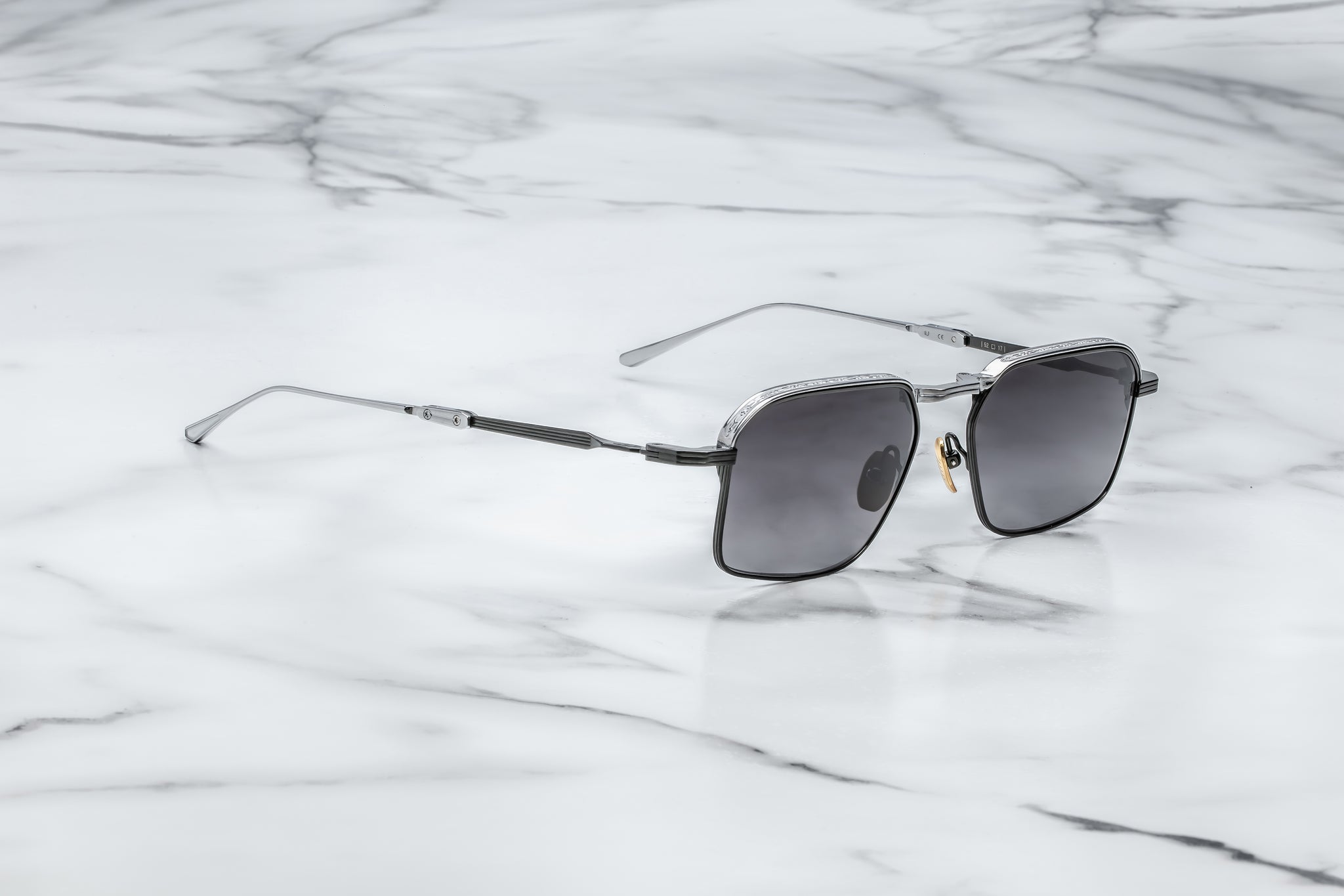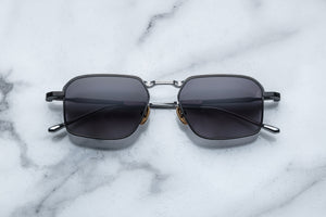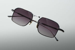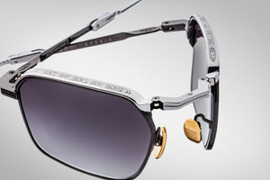 Classic ’60s-inspired folders handcrafted in Japan using 100% beta titanium, a sophisticated rectangular shape with a medium fit, featuring hairline-engraved wire rims, tailfin-shaped temple tips with recessed volumes, and extraordinary polished metal and epoxy details.