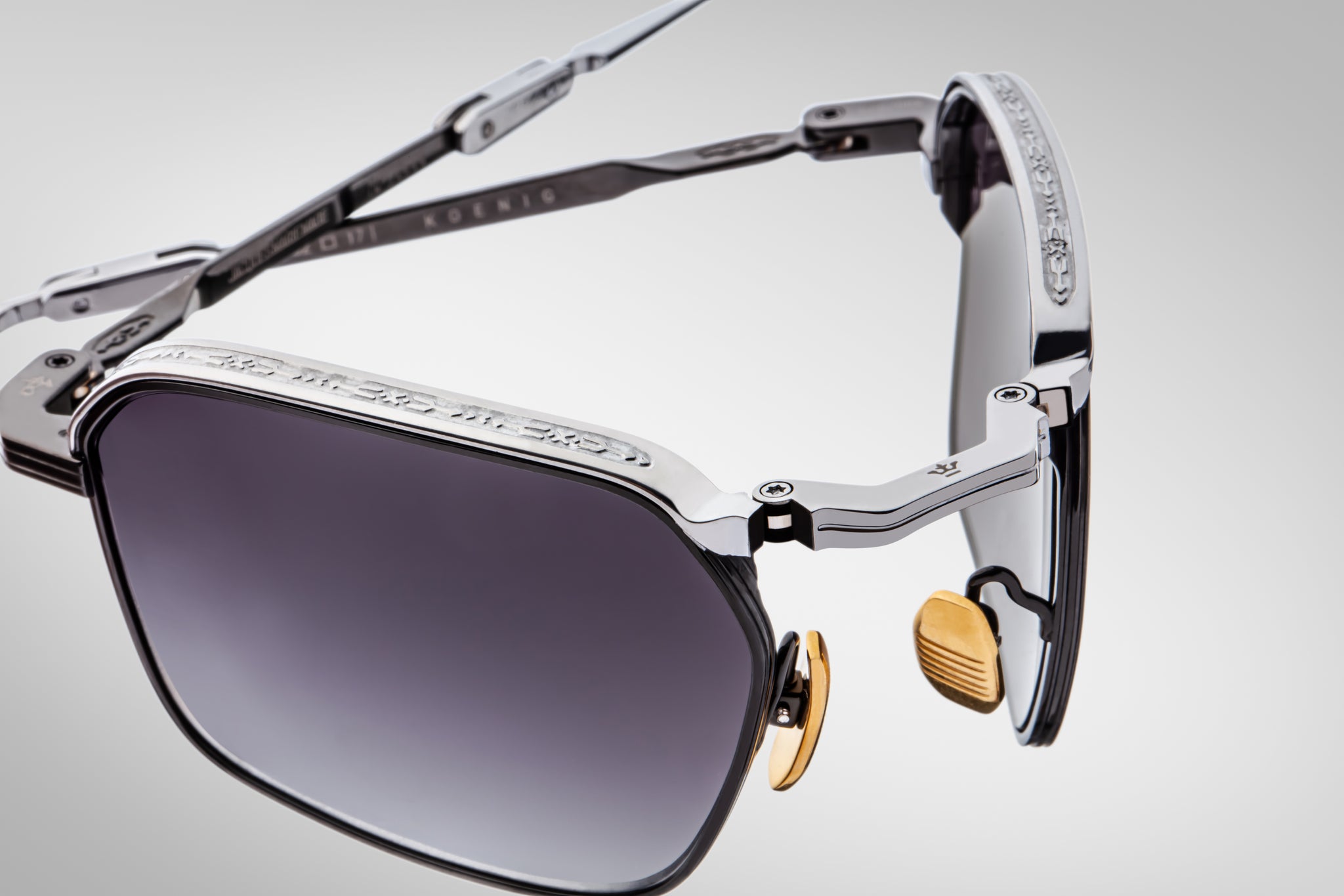 - Custom gold nose pads with logo and hairline engraving