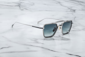 Sleek, rectangular, ‘70s-inspired spectacles with coined-edge profile, unique 6MM titanium lens-rim inserts, distinctive double bridge and temples with dual-tone embellishments and our signature hairline details.