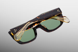 Material: Havana 10mm cured cellulose acetate frame with custom double laminated acetate temples featuring precious metal hardware